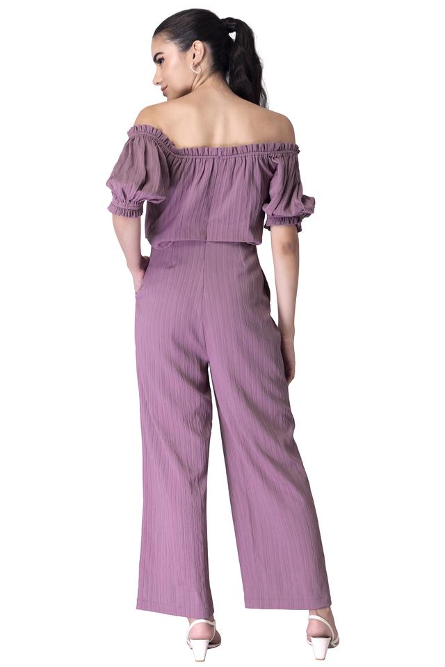Purple off the shoulder jumpsuit hot sale