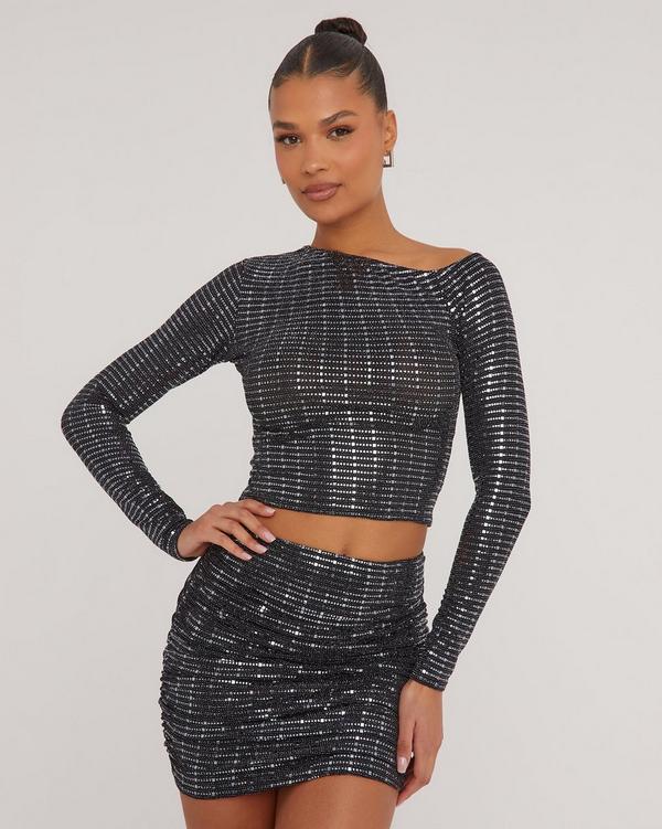 Black sequin long sleeve crop top hot sale